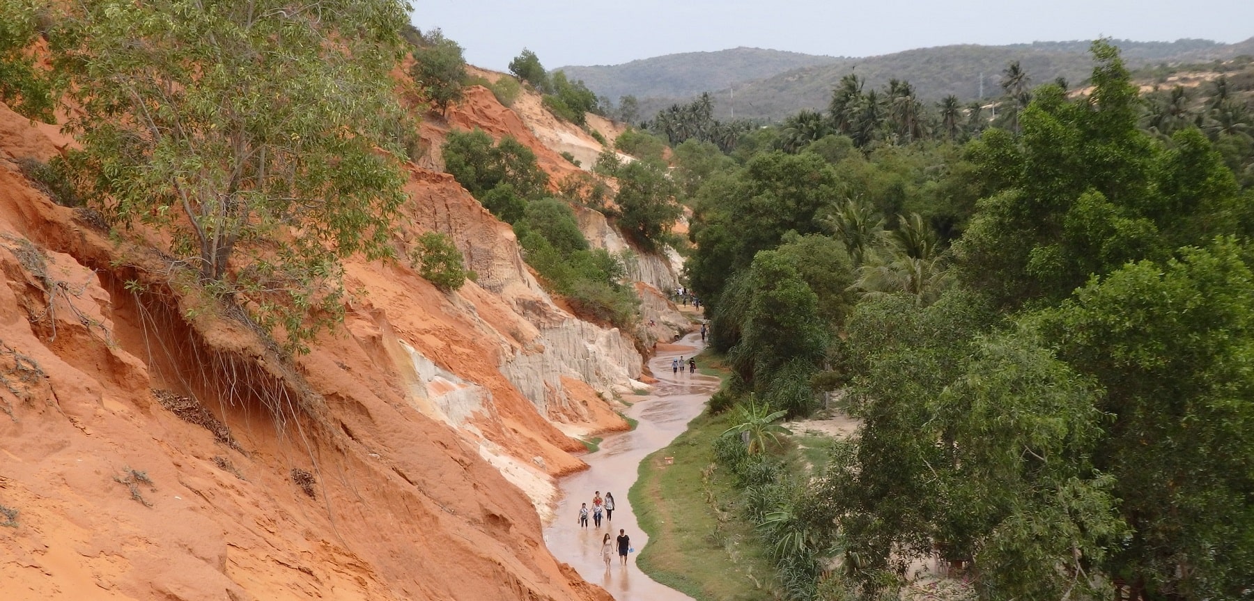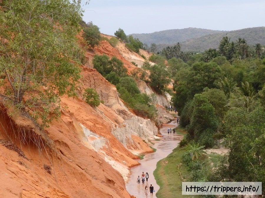 グエンディンチウ通りに架かるラン橋の下を流れる赤い渓流。赤い砂と奇抜な白い石灰岩のコントラストが幻想的です。