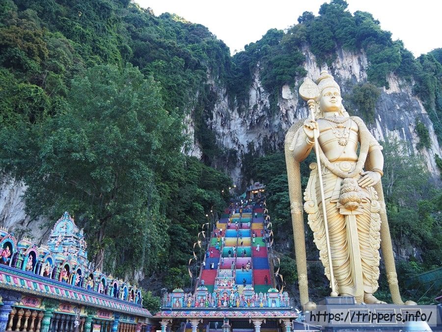 272段あるカラフル階段が石灰岩でできた洞窟へ続いており、階段の横には42.5mある金色に塗られたスカンダ像があります。洞窟にある鍾乳洞そのものは4億年前にできたと言われています。