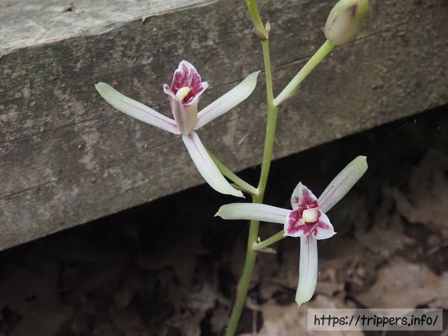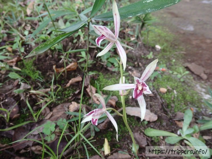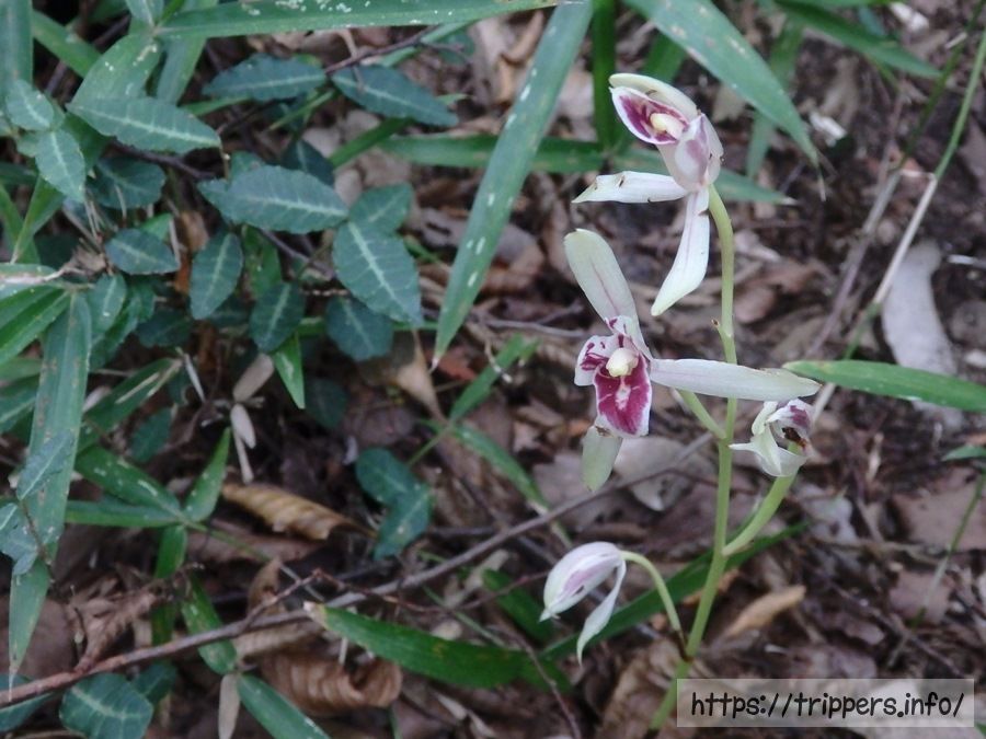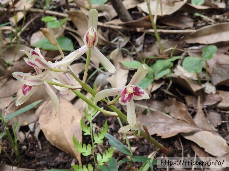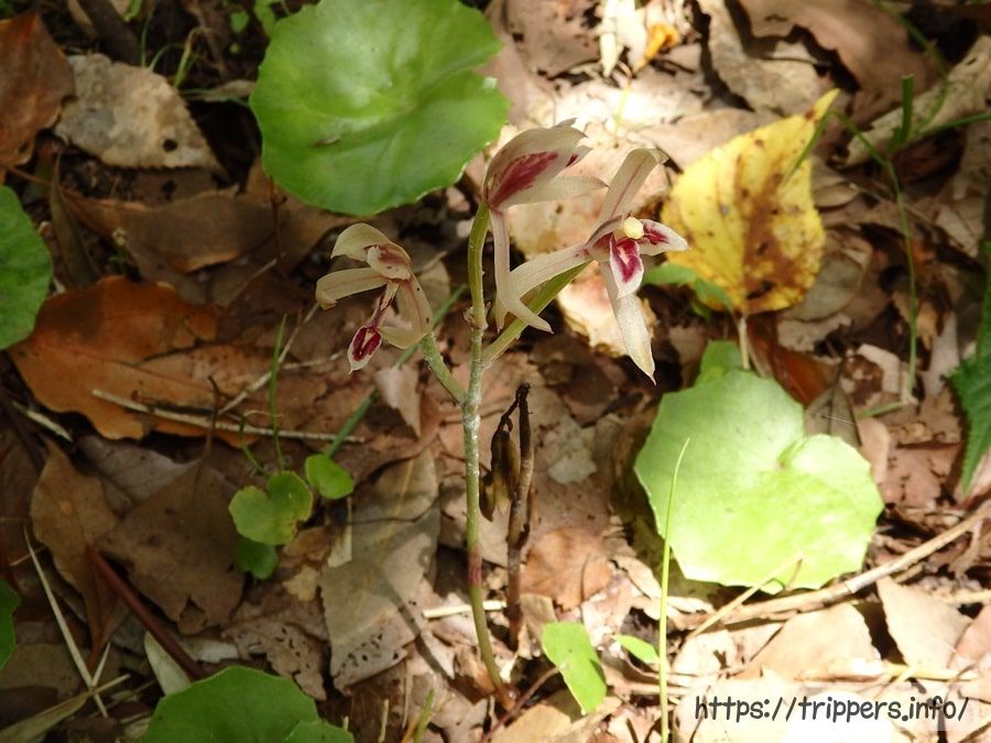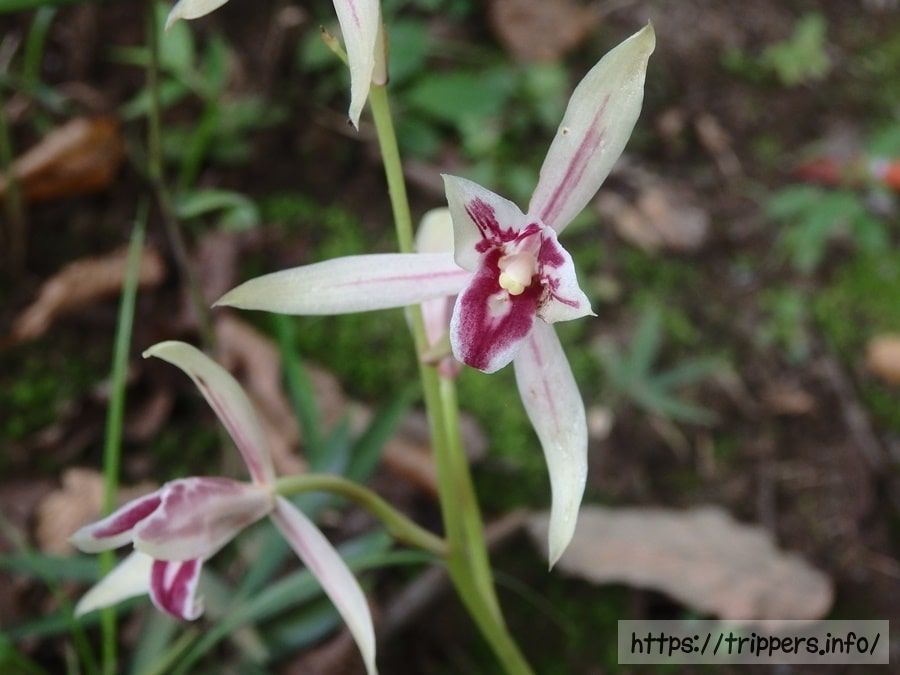 光合成をしない腐生植物のため、葉はありません。花茎の高さは10~30cm程で、花は白地に紅紫色の模様があります。レッドリストに絶滅危惧II類として記載されています。