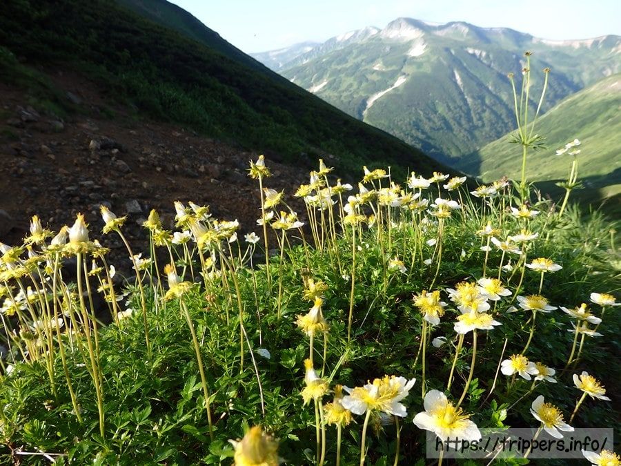 チングルマとは、森林限界のような高山帯で良く見かける落葉小低木の高山植物です。花柄は約10cmで小型の植物でありながら、地面を這うように生える樹木になります。黄色い雄しべが中央に多数集まった、小さな白い花を夏に咲かせます。その後、種子が穂状になったピンク色の果穂を伸ばします。秋になると葉っぱが草紅葉し、花柄の色が黒くなり、最後に果穂の色素が抜けて白くなります。登山シーズンの長い期間、登山者を楽しませてくれます。群生していることが多く、黒部五郎岳が花の百名山に選ばれた理由の花になっています。