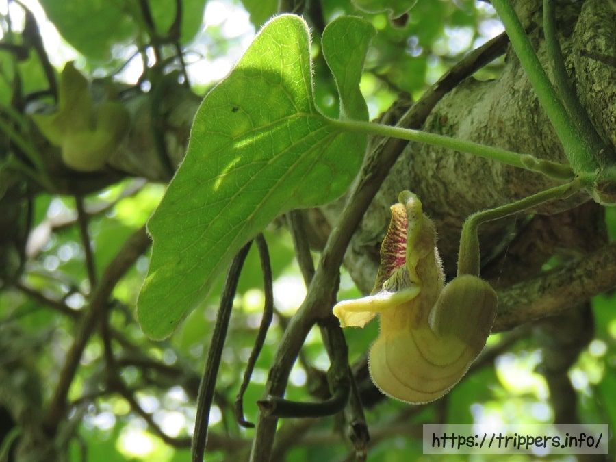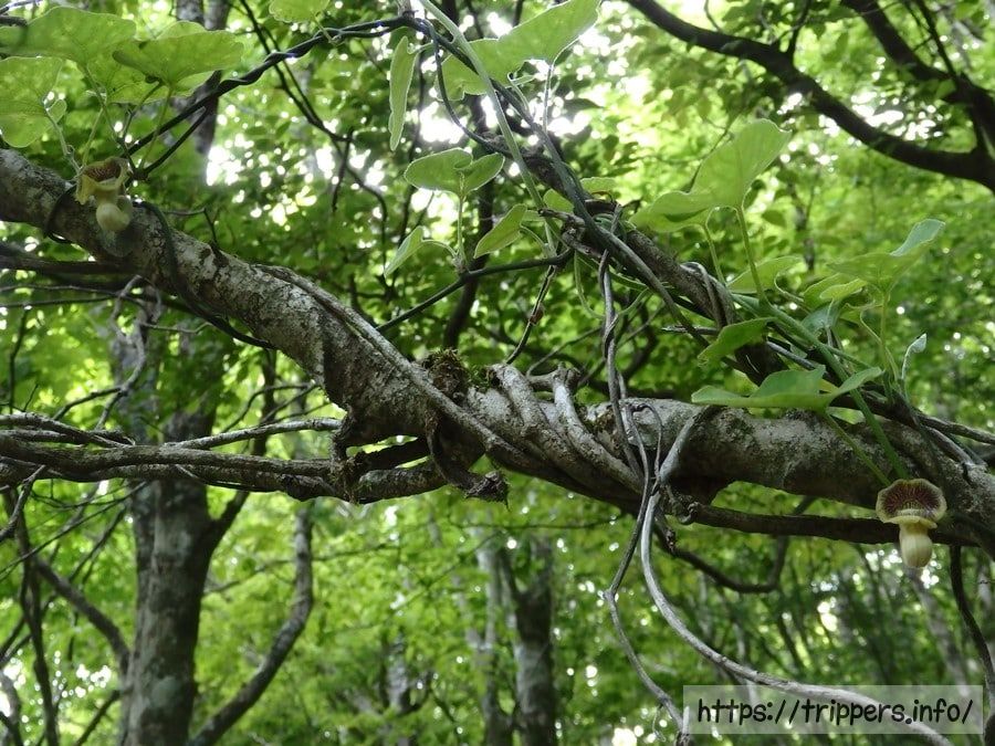 中国名は、丹沢马兜铃です。他の樹木の枝などに絡み付く多年生ツル植物です。花はオオバウマノスズクサと非常によく似ており、分布域が重なっている場所では自然交雑が起こるなど、見た目だけによる同定は難しいです。