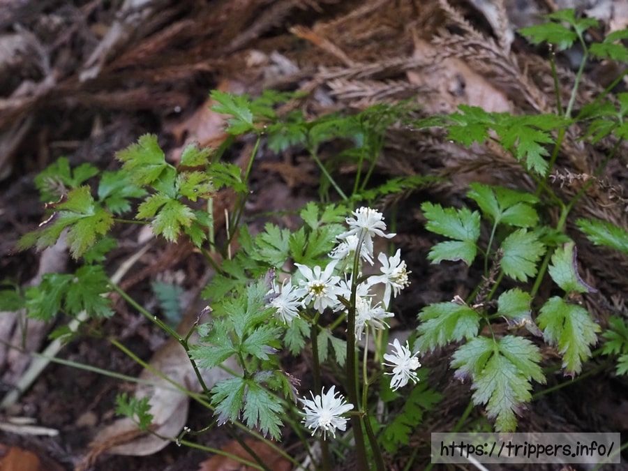 セリバオウレンとは、オウレン(キクバオウレン)の変種であり、太平洋側や西日本に広く分布する日本固有種です。複葉を構成している1つ1つの小葉がセリの葉っぱに似ていることが、名前の由来になっています。2月頃開花する直径1cmほどの花には、両性花、雄花、雌花があります。萼片と雄しべは白く、雌しべは紫褐色もしくは緑色であり、多様性がある白花です。根茎を乾燥したものは生薬「黄連」として漢方薬の材料になります。ベルベリン(アルカロイド)という成分が含まれおり、消炎、止血、精神不安などの効能があります。