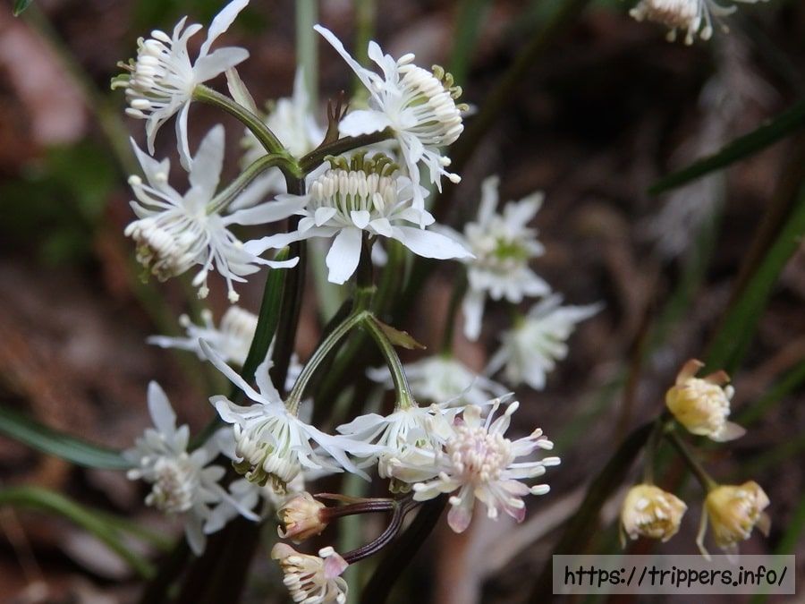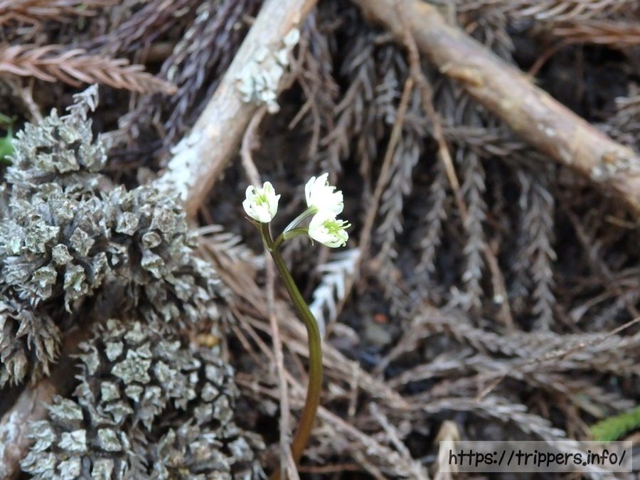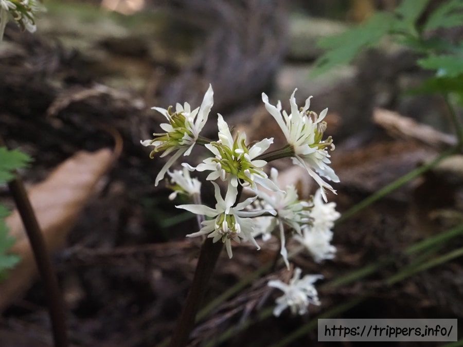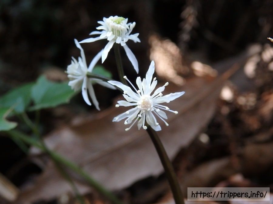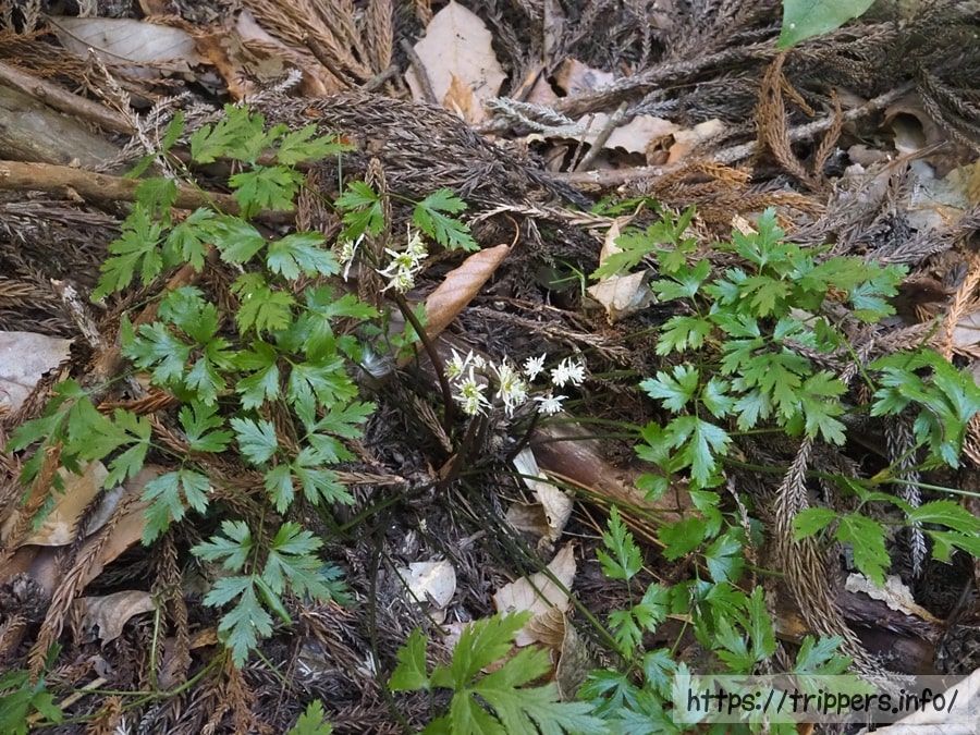 葉っぱがないと、どのオウレンの変種か区別がつきにくいです。セリバオウレンとキクバオウレンの違いは葉にあります。 セリバオウレンの葉は2回3出複葉(葉柄が2回3つ又に分かれた先に小葉がつく)となっています。日本海側に多く分布するキクバオウレンは、1回3出複葉です。異なる変種のコセリバオウレンは3回3出複葉です。