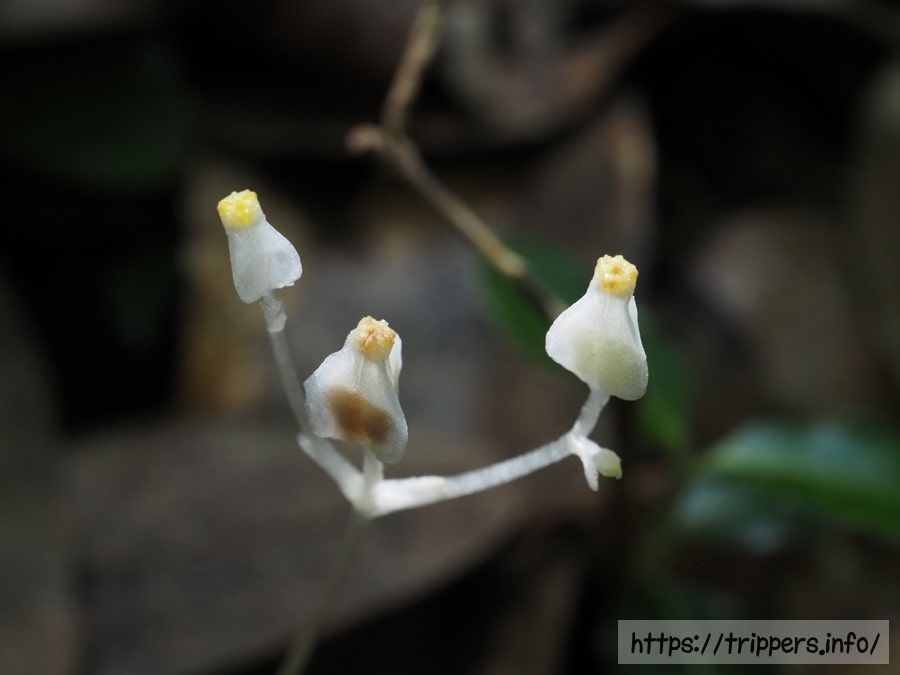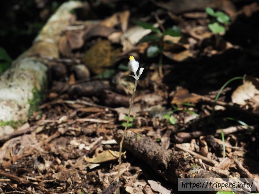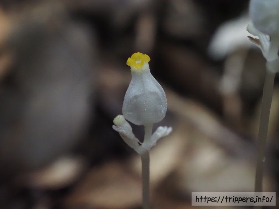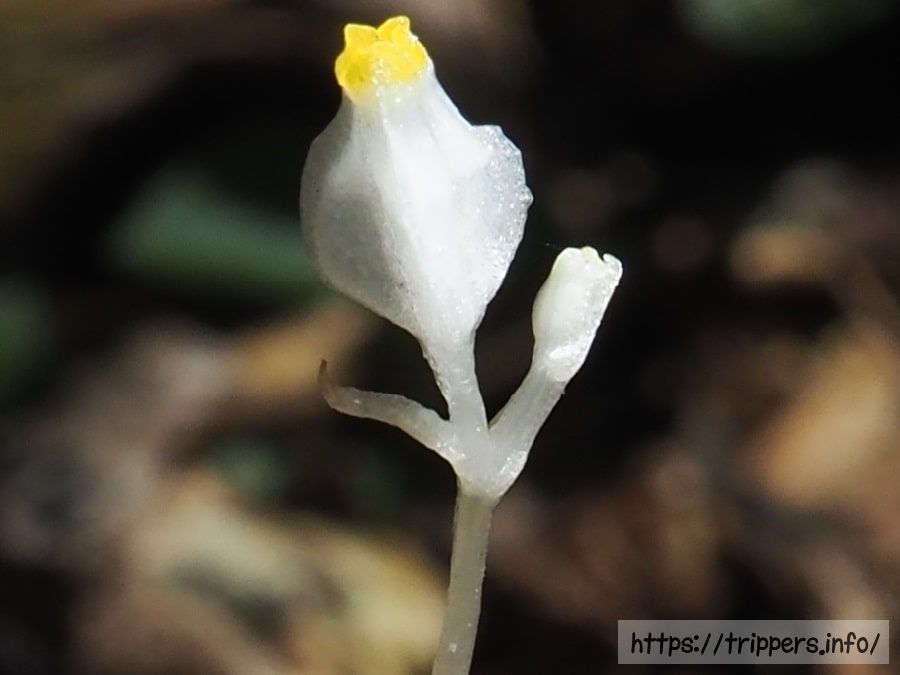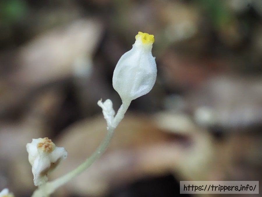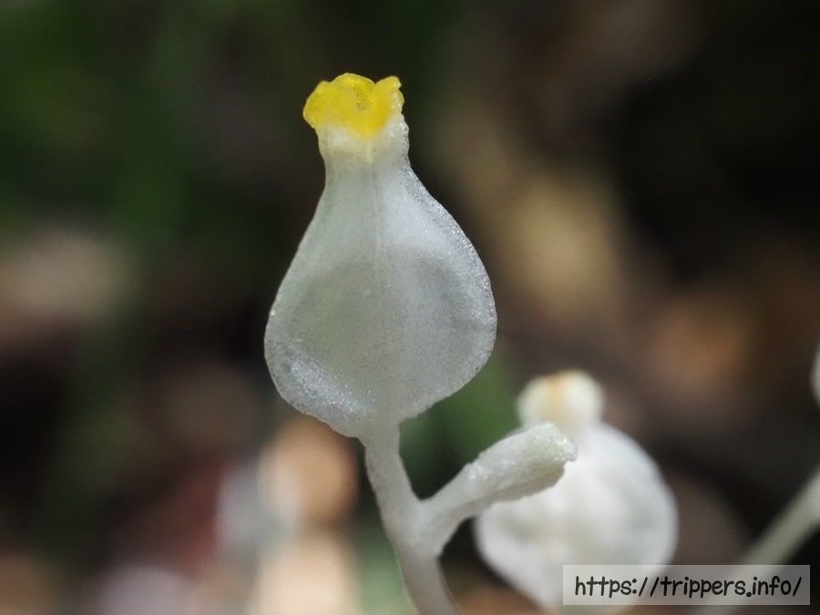 長さ約10cmで糸のように細い茎を地面から伸ばし、枝分かれした先端にそれぞれ1つの花をつけます。長さ5mm程ある花には三稜があり、側面から見ると袋をすぼめたような風船形(卵形)をしています。くびれた先端は淡黄色を帯びています。それ以外は全身が白く、葉が退化した鱗片葉も白色です。