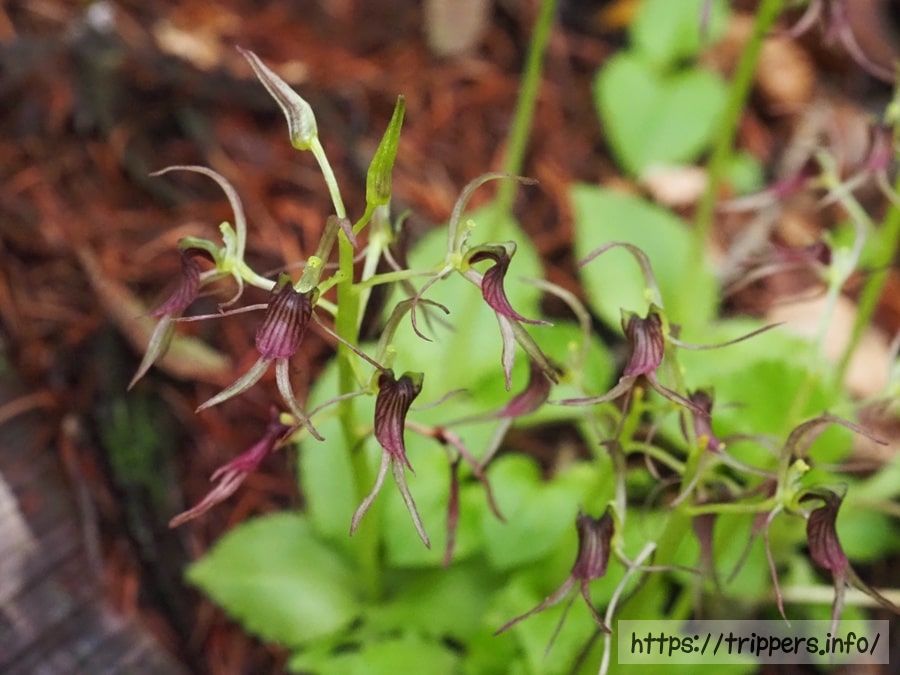 唇弁の紫褐色をした7本の筋が特徴です。唇弁の長さは約6~8mm程で、花全体の長さは2cmもないくらいです。植物全体が手のひら位のサイズです。