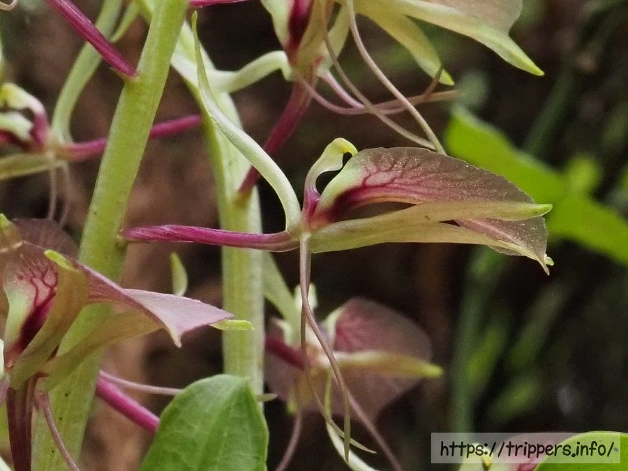 唇弁は鈴虫の透明な羽や、その翅脈に似ています。花を構成している蕊柱の基部は頭上から見ると、昆虫の目のように見え、触角のような側花弁や、長い後ろ脚のような側萼片は昆虫そのものです。黄緑色の背萼片の下には花茎と花を繋げる赤紫色の花柄子房があり、180度ねじれています。花柄子房の基部には極小の苞が存在します。