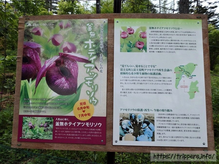 富士見町(入笠山)にある入笠すずらん山野草公園の実験園です。柵越しから、釜無ホテイアツモリソウを観察することができ、開花する6月は多くの登山者で賑わいます。