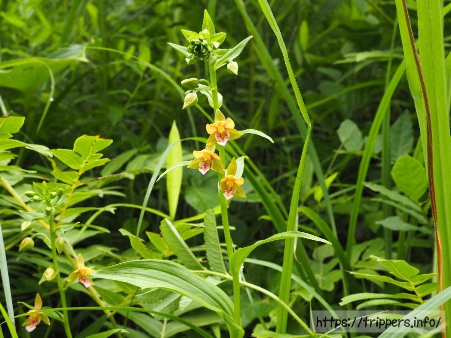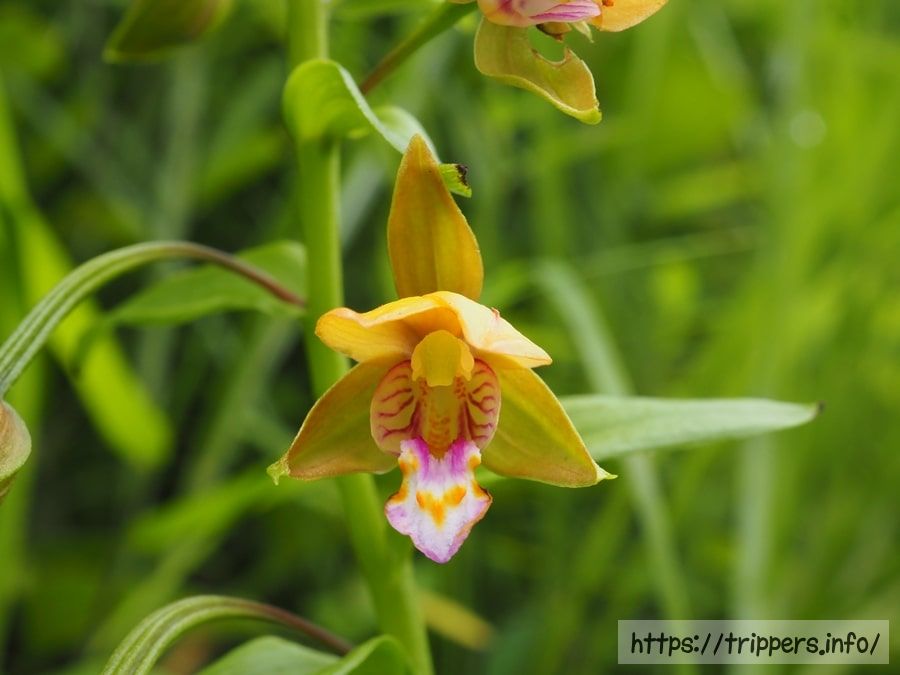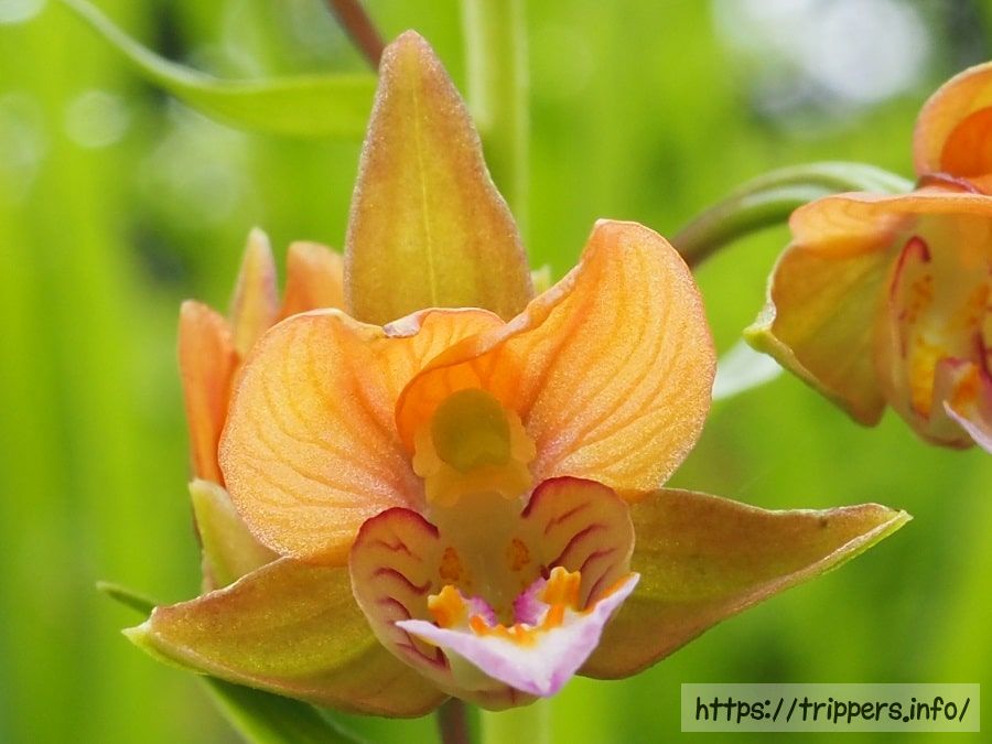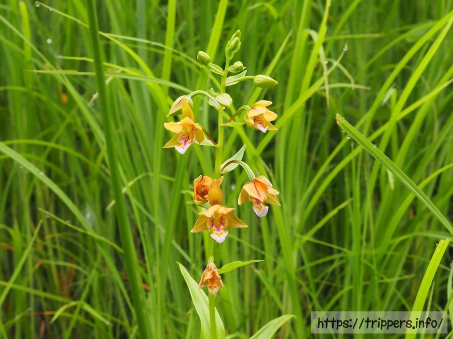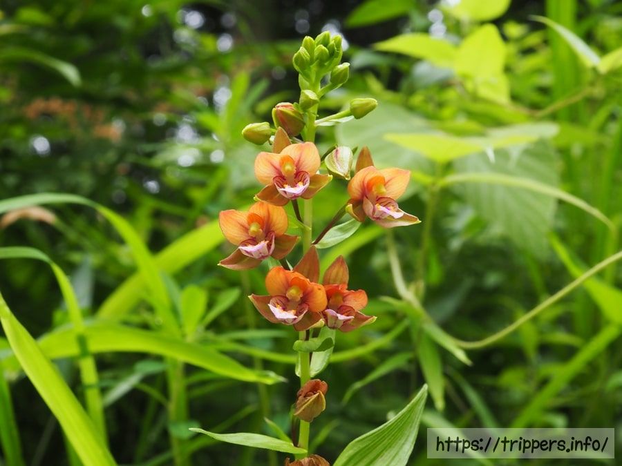 カキランとは、黄褐色の花を複数咲かせ、唇弁にある紅紫色と黄褐色のコントラスト模様が特徴的な多年草のラン科植物です。日当たりの良い湿原や湿地、田んぼの土手など湿った場所に自生しています。