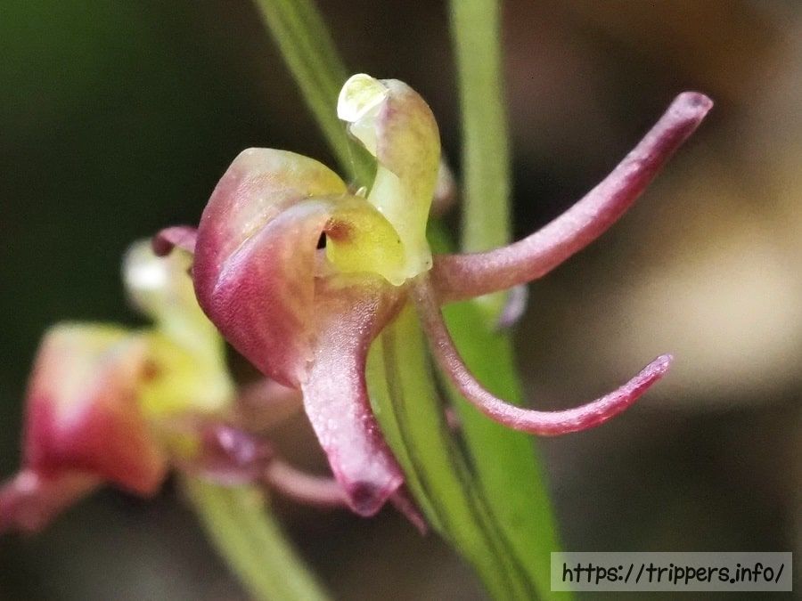 長楕円状倒卵形の唇弁は長さ6㎜程です。羽のような見た目の側萼片は幅3mmあり、軽くねじれることもあります。虫の脚のような紐状の側花弁は反り返ります。背萼片の手前にあるずい柱の先端には2つの黄色い花粉塊があります。