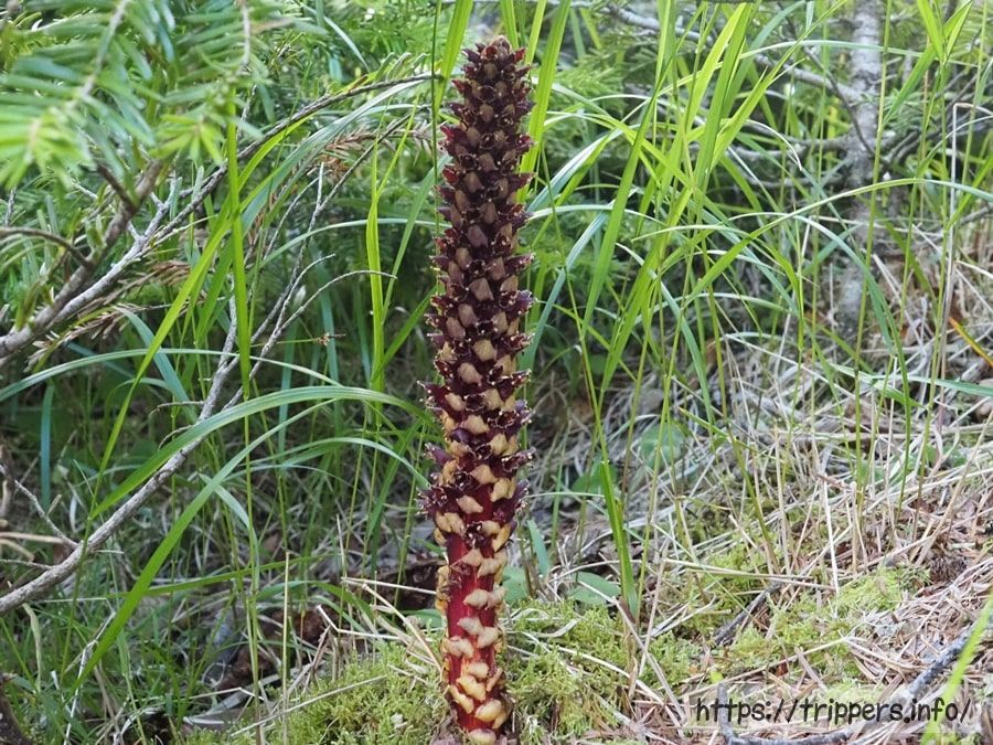 産地局限のため、オニクに出会うことはとても珍しく、同じ場所で毎年出会えるとは限らないです。生薬になる寄生植物であるため採取されてしまうこともあります。
