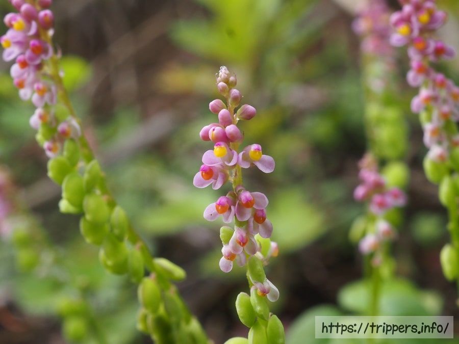 ヒナノキンチャクとは、丸い淡紫色の花を無数に咲かせる小さい一年生植物です。黄緑色の果実が巾着に似ていることが名前の由来になっており、全国的に自生地が限られており絶滅危惧種に指定されています。草丈は7~15cmあります。