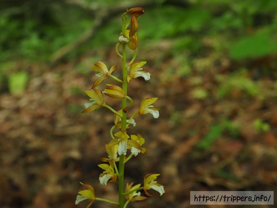 山地や林内のやや湿った場所に自生し、草丈は30~40cmになります。バルブから2枚の披針形をした葉が伸び、幅は約2cm、長さは20~30cmあります。側花弁と背萼片、側萼片はそれぞれ披針形でかつ黄褐色をしており、外側は赤褐色が混ざります。唇弁は基部で3裂し、中央部の中裂片と両端に小さな側裂片に分かれます。色は白色です。個体によっては唇弁に紅紫色の斑点や存在したり、唇弁の先端が紅紫色や黄色に染まっています。中央から蕊柱が伸び、先端に黄色い花粉塊を付けます。