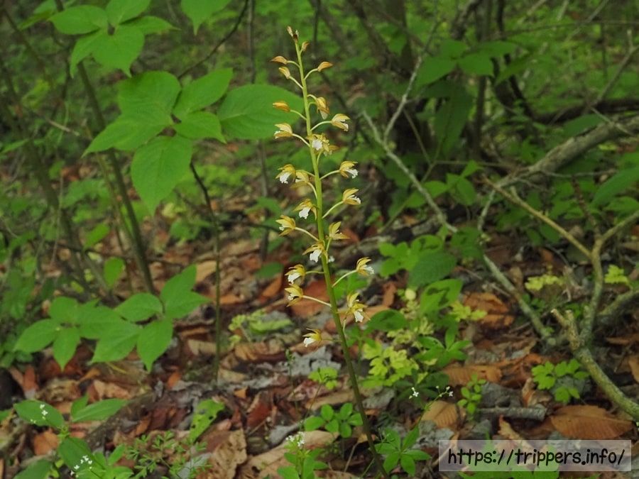 黄緑色の花茎から伸びる花柄子房は黄色がかった薄い黄緑色をしており、180°ねじれて先端に花を付けます。花は距がありません。