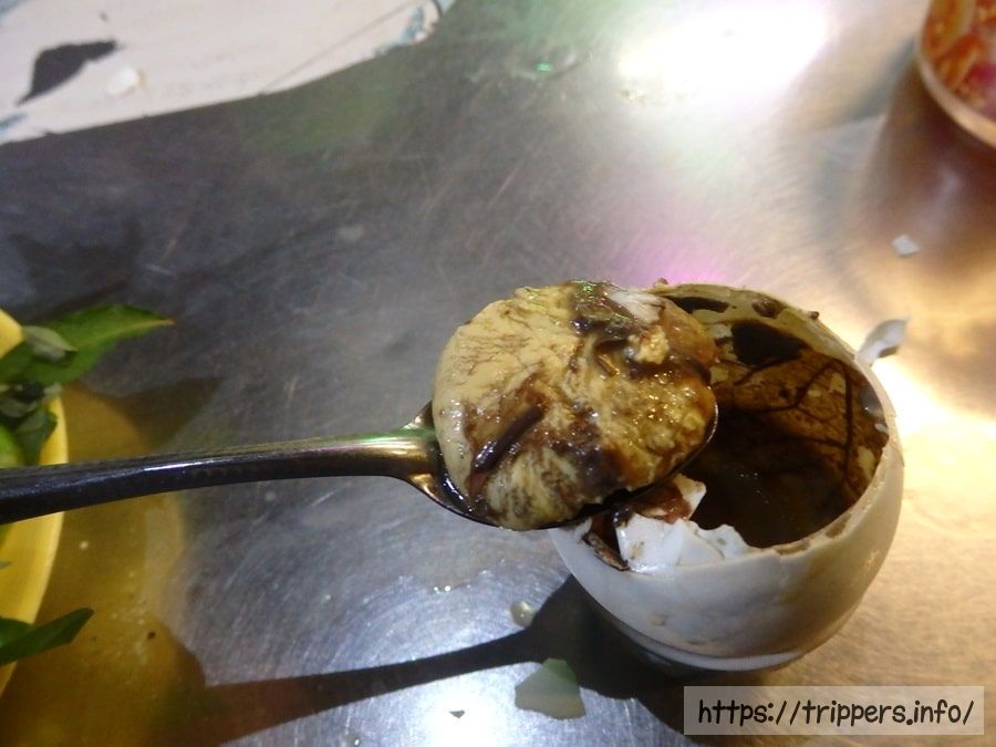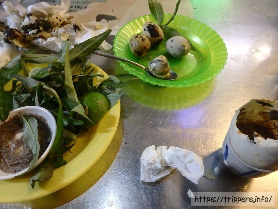 ウズラの卵は手で殻を剥いて、塩コショウと一緒にそのまま食べます。ポンティアコーンのお味は、不味くはないですが美味しいものでもありません。ゆで卵よりも固く、ゴムのようです。しかし卵の中に含まれている汁は鶏ガラスープのようで、すごく美味しいです。臭いはありません。