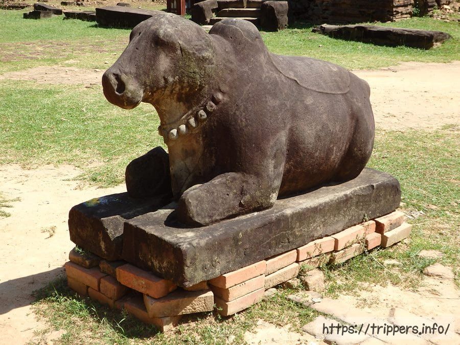 ナンディンはヒンドゥー教に伝わる、シヴァの乗り物とされる乳白色の牡牛です。聖なる牛という意味のプリア・コーの名前の由来になりました。6基の祠堂が建つ基壇の手前に3体のナンディン像があります。