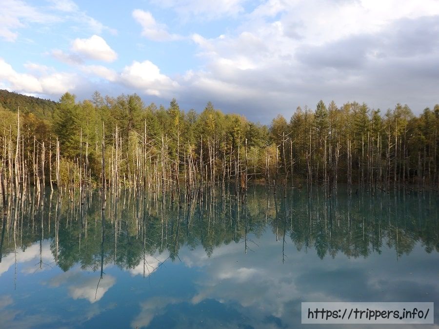 1988年12月に噴火した十勝岳の堆積物による火山泥流災害を防ぐため、美瑛川本流に複数建設された堰堤のひとつに水が溜まった人造池です。太陽光の散乱によって青い色に見える水の中で周囲に自生していたカラマツ、白樺等の樹木は水没し立ち枯れ、現在の姿になりました。綺麗な青い池を見るには、「風が無く・雨が降らず・晴天」であることが条件で、立ち枯れした木々と空が湖面に映った姿はとても美しいです。