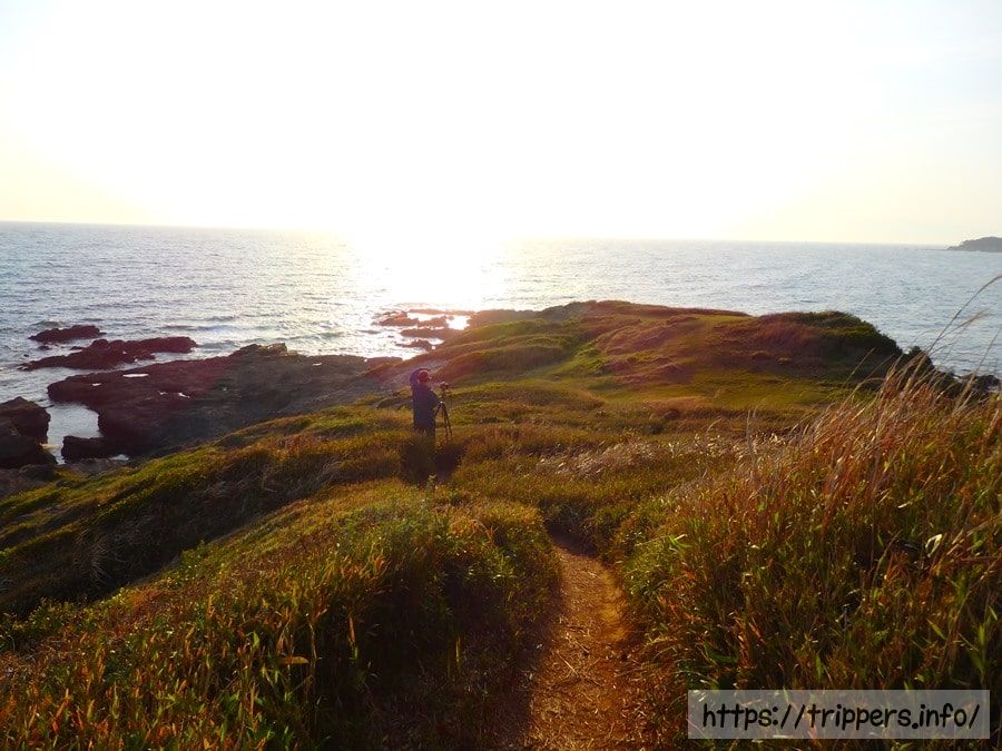 三戸海岸と長浜海岸の間にあり、小高い丘になっている岬。ここから眺める夕陽は金色に輝く草藪と相まって絶景です。マイナーな観光スポットで人はほとんどいませんが、釣り人や地元の写真家がいたりします。