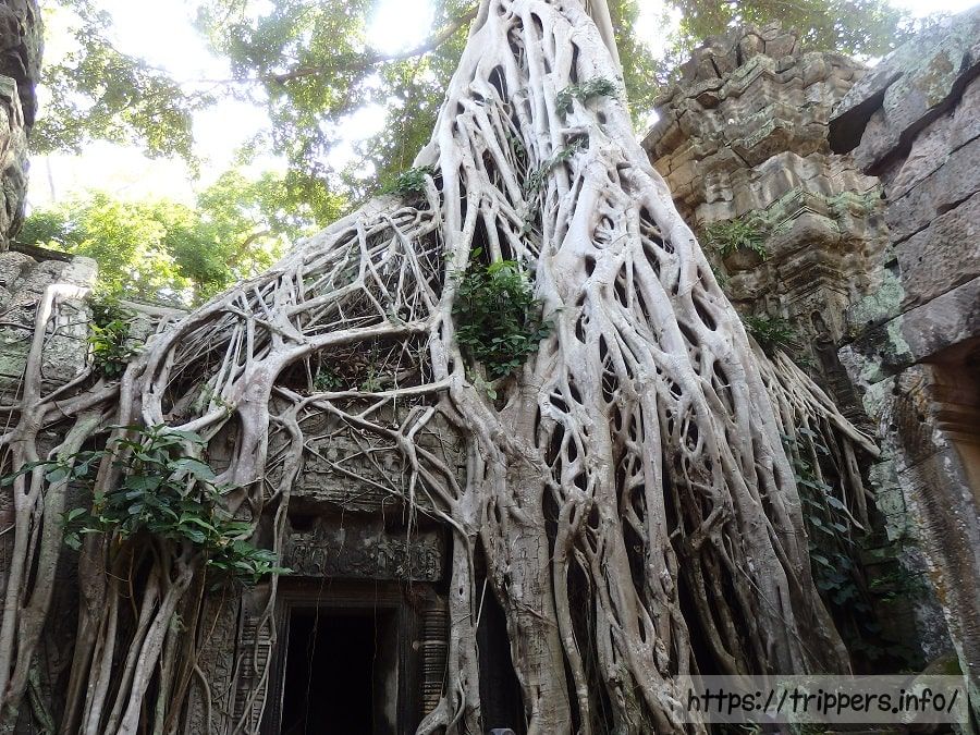 ジャヤーヴァルマン7世が母を弔う為に1186年創建した仏教寺院です。後にヒンドゥー教寺院に改修されたと考えられています。樹齢300年を超えるスポアン(ガジュマルの1種)による浸食が激しく、遺跡に絡みついています。東西1km、南北700mの周壁に囲まれた寺院で、かっては5000人余りの僧侶と615人の踊り子が暮らしていたと伝えられています。