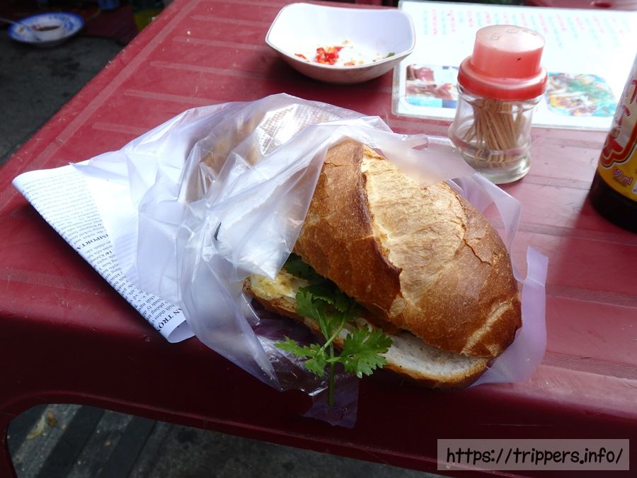 本日参加するメコン川クルーズが始まるまでの間に露店で販売していたバインミーで朝食。普段フランスパンはパサパサして硬いイメージがあるので食べませんが美味しかったです。卵のフワフワと野菜の水分とシンプルな味付けが良かったです。