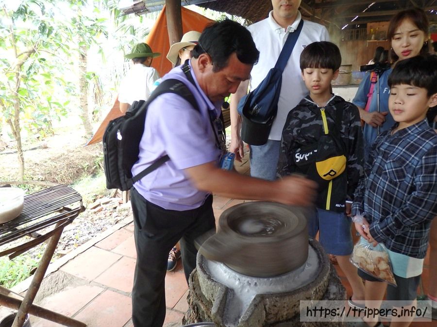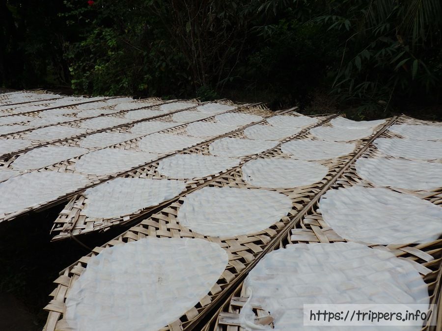 ライスペーパーの作り方をガイド自らが実演しています。クレープと同じように水で溶かした米粉を薄く焼いて乾燥させ、一枚一枚作るようです。ライスペーパーやお土産の販売も隣でしてました。