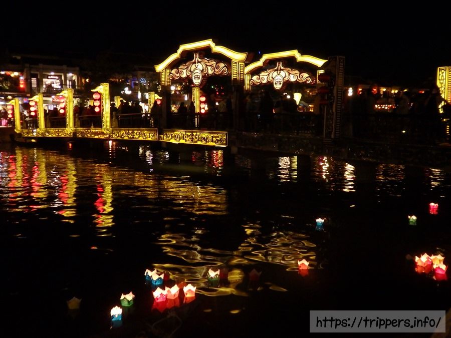 食後は自転車を市場に置いたまま夜の街並みを観光です。ランタンの街なので夜が幻想的です。