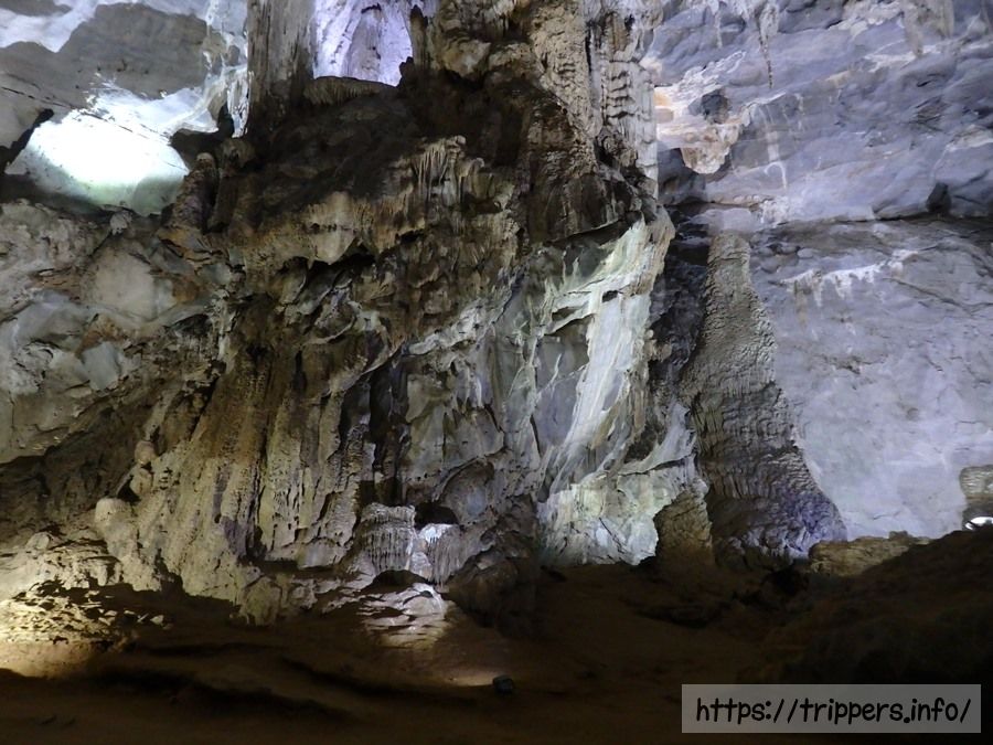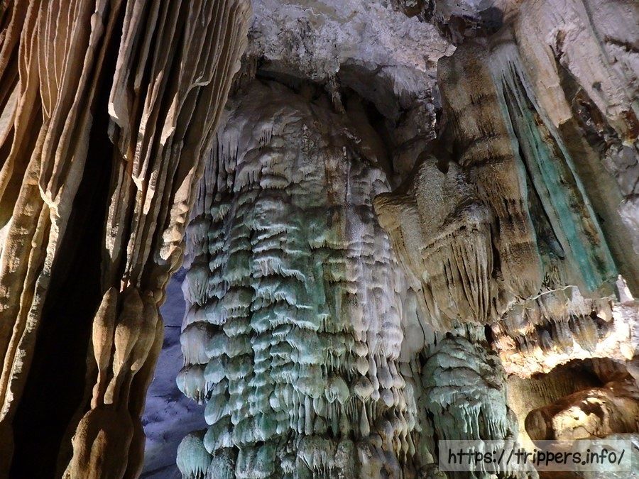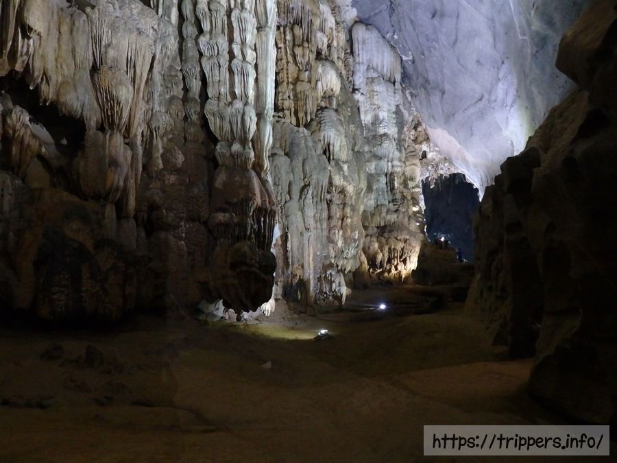 フォンニャ洞窟の特徴は規模はないものの、策で囲われた通路がない事です。好きに歩き回れるし写真に策が映らないし、触ろうと思えば鍾乳石や石筍に触れる事が出来ます。また地面が砂になっており、本物の惑星にいるようです。