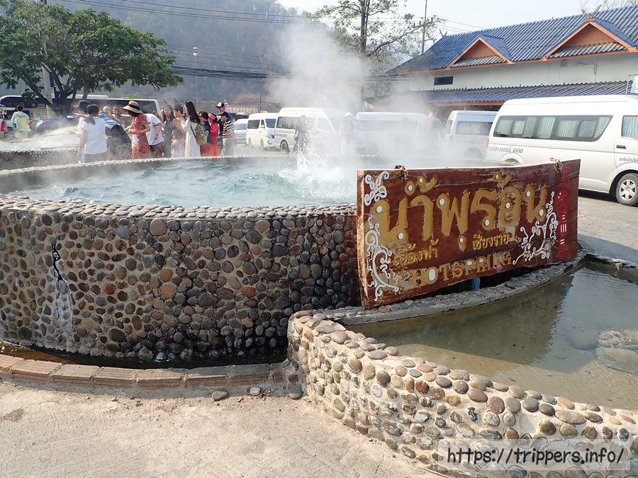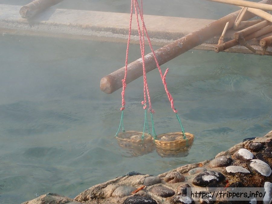 最初にメーカチャン温泉に立ち寄ります。ここでは温泉卵を自分で作って食べる事ができるようです。足湯も可能です。