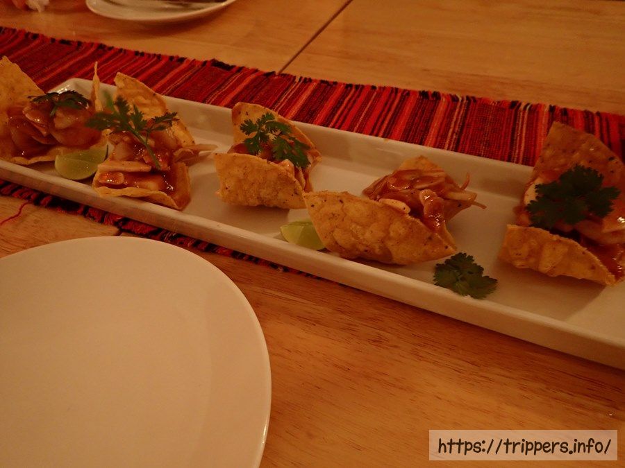セット注文してまず最初に出てきたのがこちらの料理。メキシコ料理を食べたことがなくドンタコスの様な味をイメージしていたのですが、酸っぱくて激辛でしょっぱさは皆無でした。口に合いませんでした。