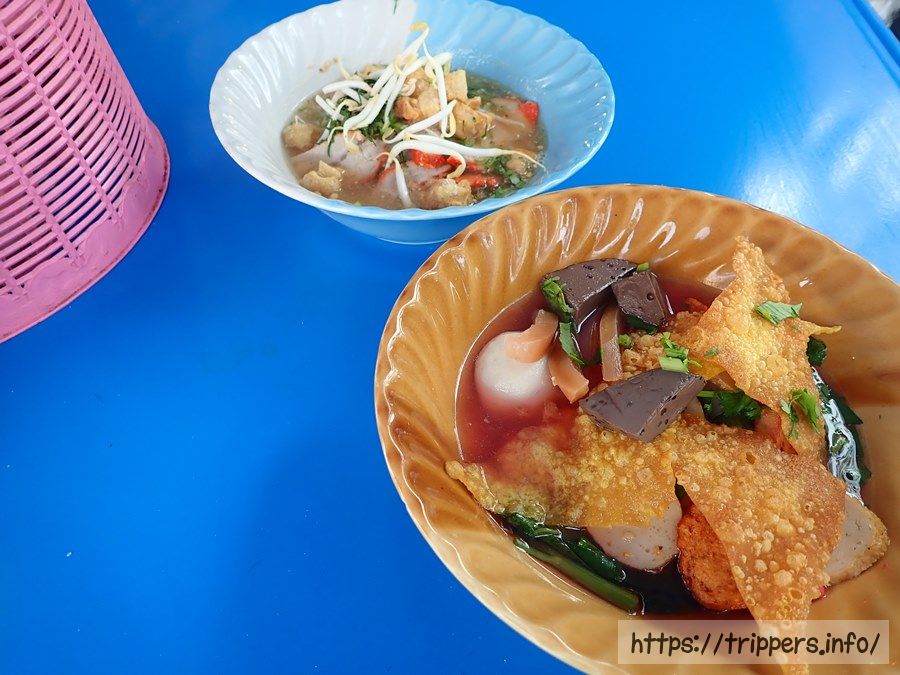 コンニャクみたいな灰色の食材はルアッ・ムーと呼ばれる豚の血の塊で味は特にないですが、美味です。1杯35バーツくらいでした。お水はセルフサービスで飲み放題です。