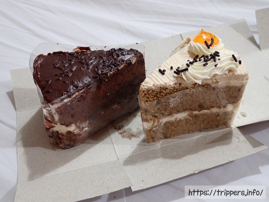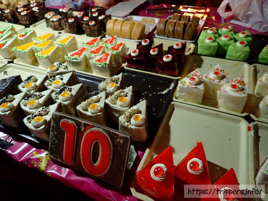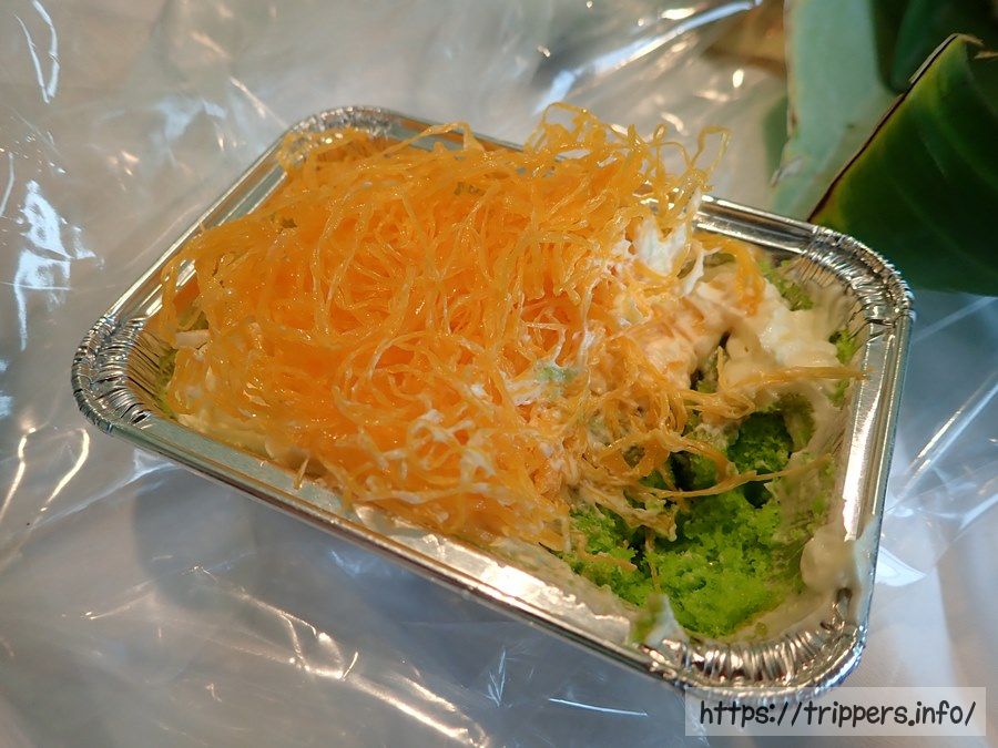 左はバタークリームのケーキです。上に載っている人参の細切りの様なものは何だか良く分かりませんでしたが、昨日の夕食を食べた場所でもこれが乗っかったデザートが売っており気になってました。細切りの物体は味はありません。たぶんココナッツの内皮を着色したものだと思います。1つ10バーツくらい。