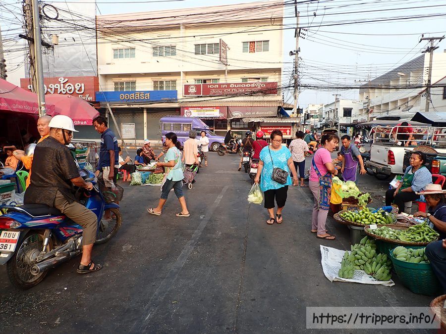 ホテルから見る朝のピッサヌロークの街並みです。今日は8:55の電車に乗って、12:18にロッブリ―に到着する予定です。まずは朝食を食べに市場に出かけます。