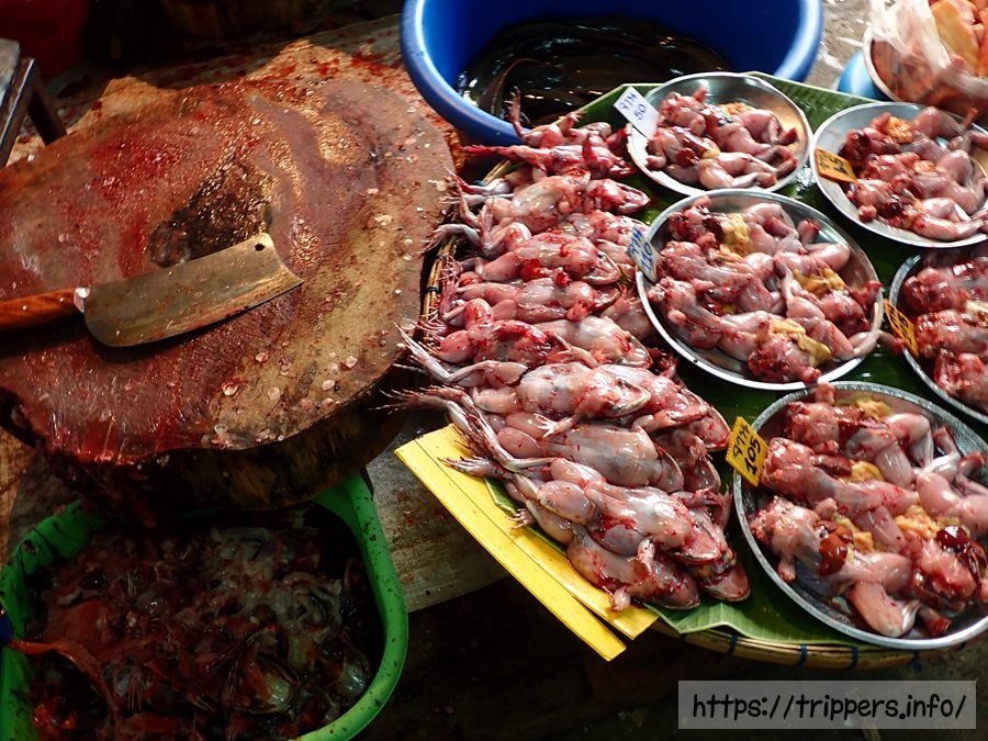 こちらはカエルです。そういえば昨日バス停からホテルまで歩いてる途中で初めてゲテモノの揚げ物屋台を見かけました。ミルワームやサソリや昆虫の素揚げのようです。チェンマイのナイトマーケット(Ploen Ruedee Night Market)でサソリ1匹100バーツを見かけたのですが、ゲテモノ販売を見かけずに終わるのかと思っていました。