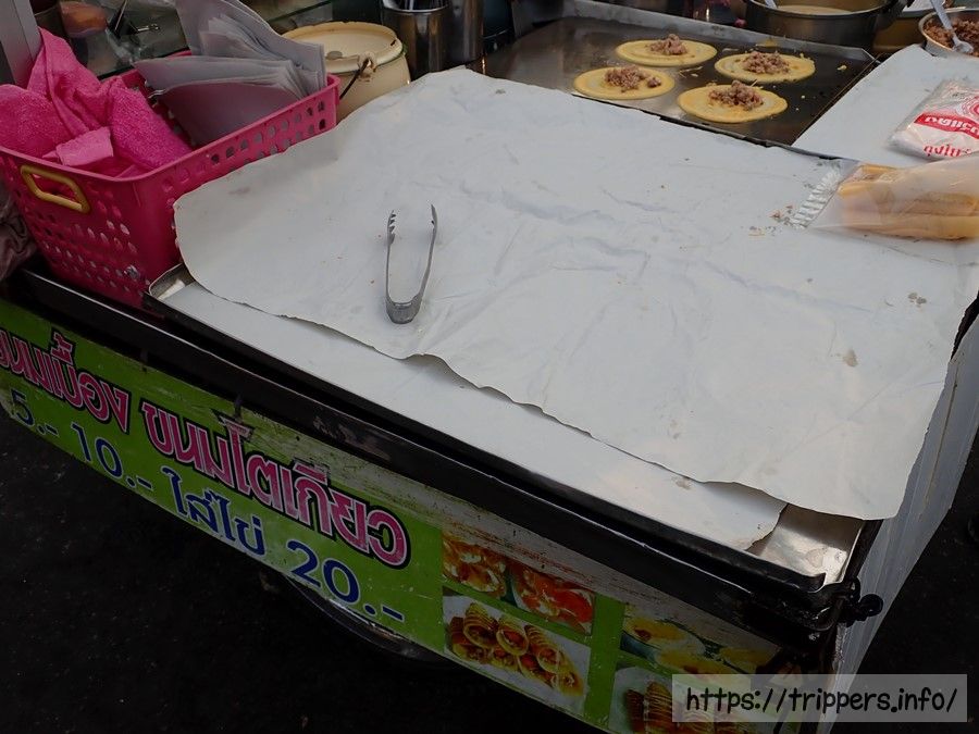 ここで卵クレープの肉巻きのようなものを1つ10バーツで買ってみました。タイ語を読めないので、何を売っているのか分かりやすいと助かります。