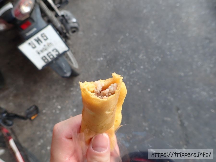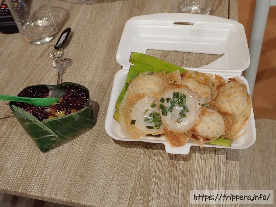 食事タイムではさっき買った食料を食べます。皮はココナッツの味がしました。中華の点心ではなく、タイの点心だと分かる料理でした。