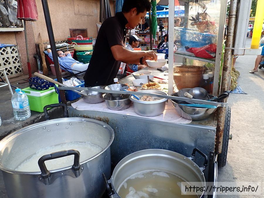 座って食べられる屋台がない中で見つけたお粥屋さん。指差しで何となく購入しました。1杯35バーツくらいです。