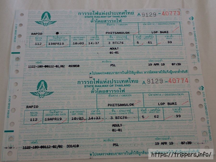 こちらが電車の乗車券で5号車の座席61と62のようです。冷房がある2等車の座席は一杯との事でした。2等車は223バーツだと思います。