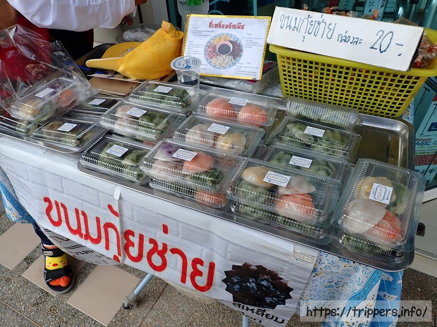 買ったのは左のココナッツのプリンのようなものと、右は「カノムクロック」と呼ばれるココナッツ生地のたこ焼きみたいなタイ伝統のお菓子です。どちらも美味しかったのですが、ココナッツの味に慣れてくるとクノールスープのコーンポタージュの味にすごく似ている気がしました。カノムクロックは米粉とココナッツミルクで出来ており、具材は定番のネギでした。