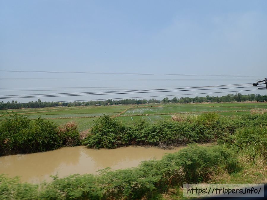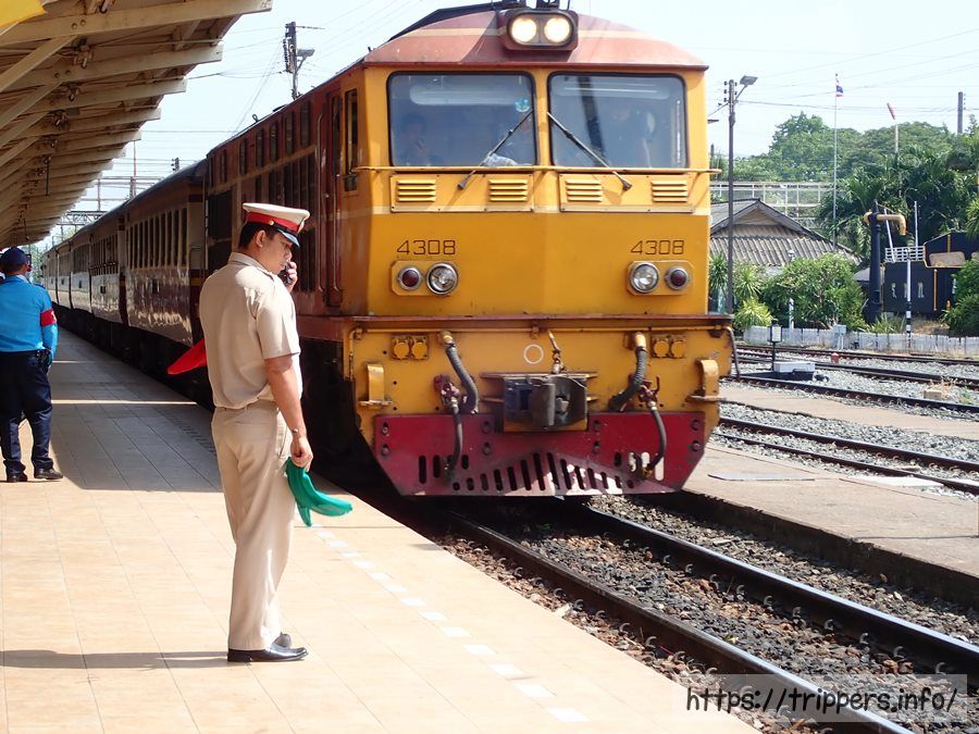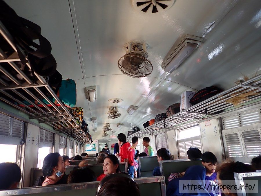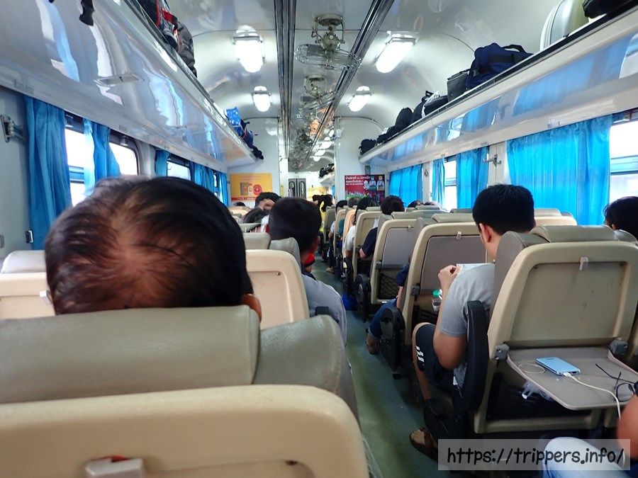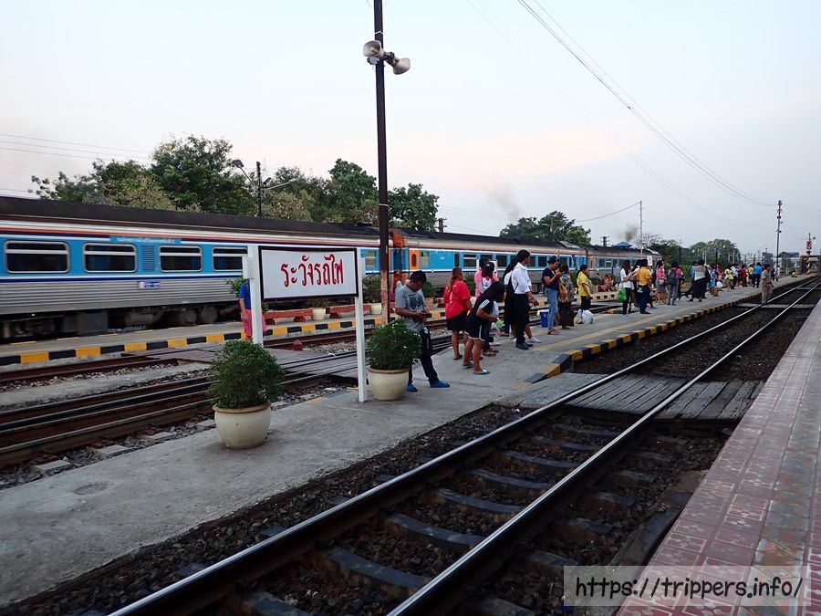 電車は5分くらいの遅れで到着しました。ネットを見るとタイの電車は満席になりやすいから事前にネットで購入した方が良いと書いてありますが、時刻通り来ないで遅れやすいとも書いてありました。結構な遅れが発生しやすいとも。