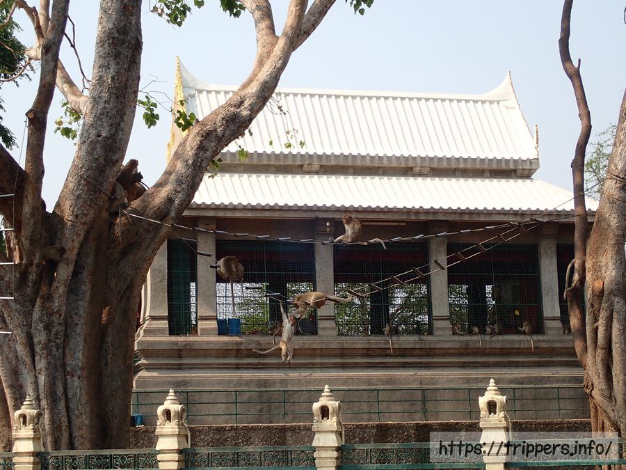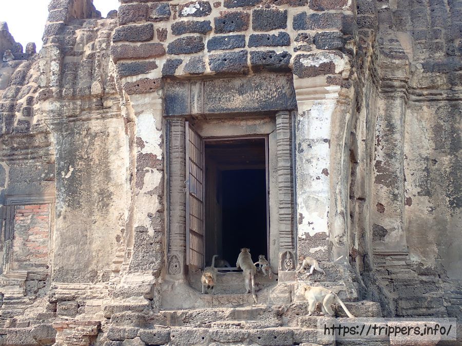 入場料50バーツを払って敷地に入ります。3基あるプラーンの中へは鉄格子の扉を開けて入るのですが、猿が中に入らないように扉は開けたら閉めるのが鉄則です。ですが、既に1匹中に入ってました。
