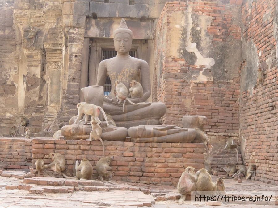 遺跡と調和する猿に見とれて写真撮影に集中する事なかれ。気が付けば猿が背後から飛び掛かってきます。全ての猿が攻撃的ではないですが、挑発な個体もいます。
