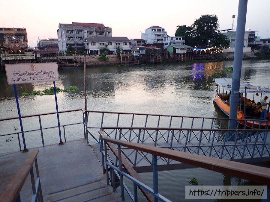 あっという間にアユタヤに到着すると駅前で女性に日本語で声をかけられます。「どこに行く?船ないよ!」どうやらタクシーの勧誘のようです。駅から観光地やホテルがある旧市街へは川で隔てられているため片道5バーツの船に乗る必要があります。