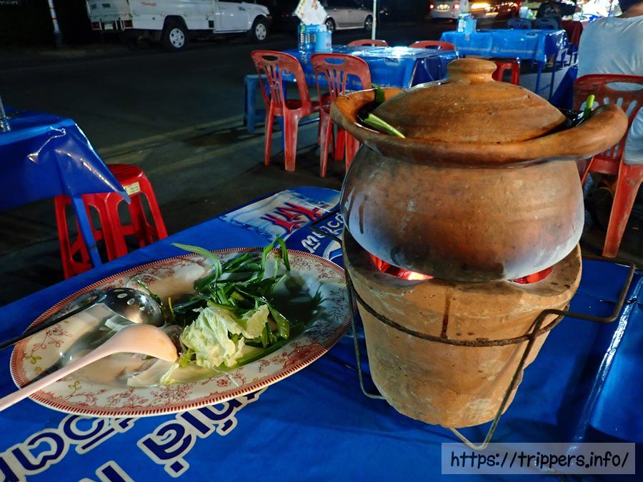 ナイトマーケットへ歩いて行き、夕食です。ムーチュムと呼ばれる鍋料理で、生卵と肉を鍋に入れ、野菜を入れて2分たてば完成です。辛いタレと甘いタレ好きな方に付けて食べるしゃぶしゃぶでした。