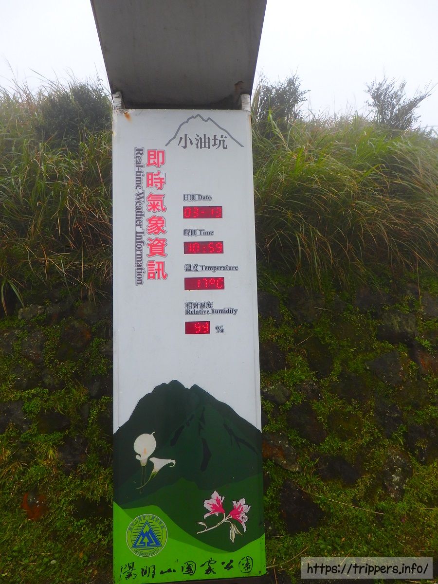 紅5のバスで1日目と同様に陽明山總站に行き、そこから108のバスで小油坑に行きました。小油坑の気温は17℃、湿度99%。雨は降っていませんが強風と霧で視界が悪かったです。