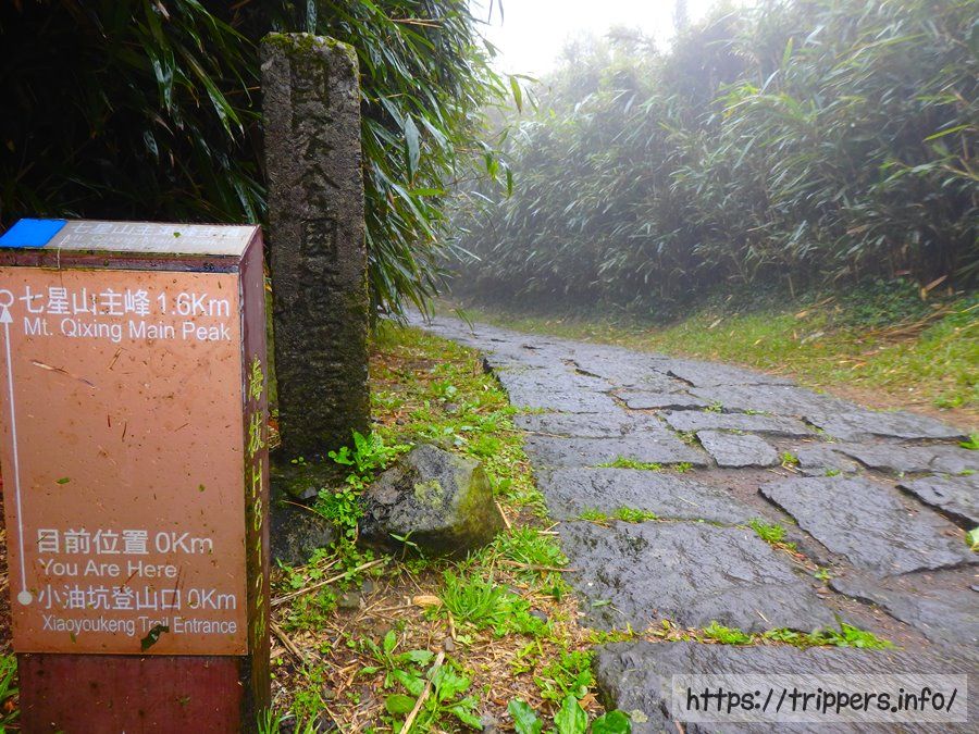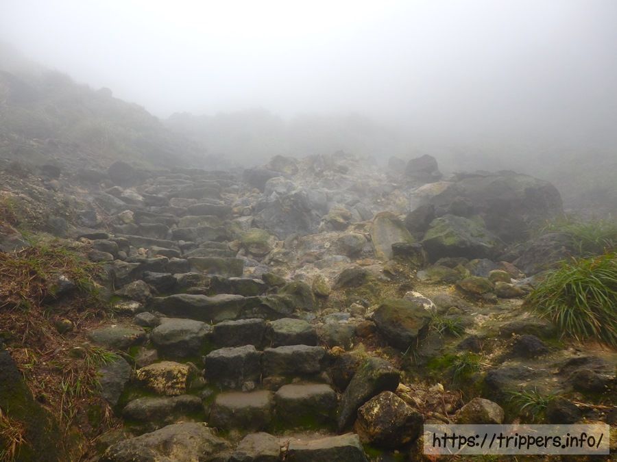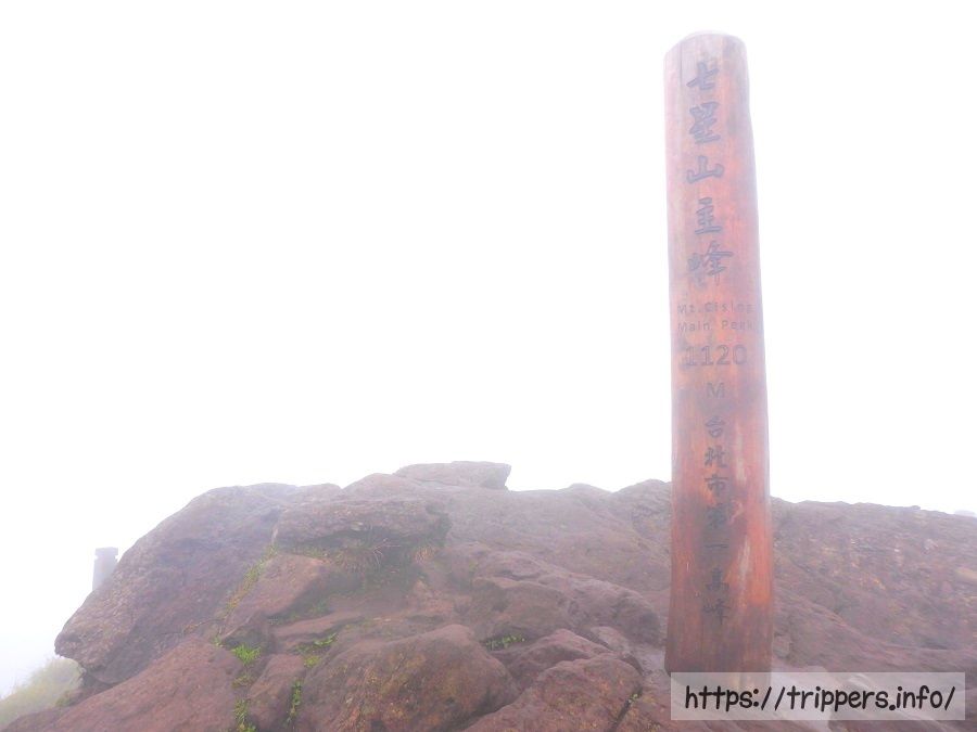 七星山の頂上に到着。ここまで一本道で迷うことはありませんでした。平坦な道と急勾配の石段の組み合わせで約1時間掛かりました。周囲を見回しても霧で何も見えないのが残念。幻想的ですが。