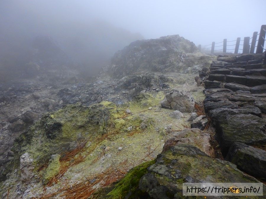 登山開始。強風で霧が雨のように斜めから叩きつける感じでしたが、雨ではないので服がびしょ濡れにはなりませんでした。少し湿る程度です。歩道の両端に生えている背の高い植物や矢竹によって強風から守られながら登る事が出来ました。