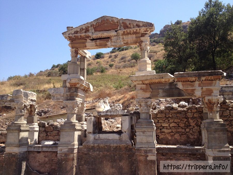 エフェソス遺跡と言ったらこの巨大な図書館か円形劇場のどちらかをイメージされるのではないでしょうか。遺跡のメイン通りであるクレテス通りの遠くから目立っていた建物です。図書館の正面入口だけが残っている形ですが、迫力ありました。前門に置かれた4体の女性像はレプリカだそうです。