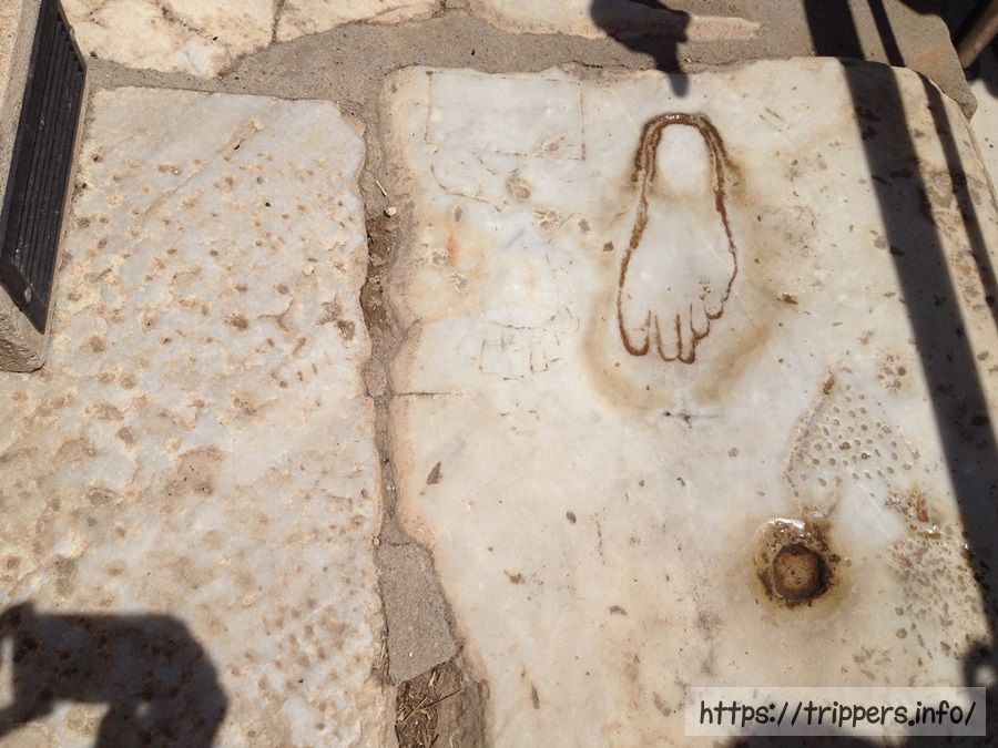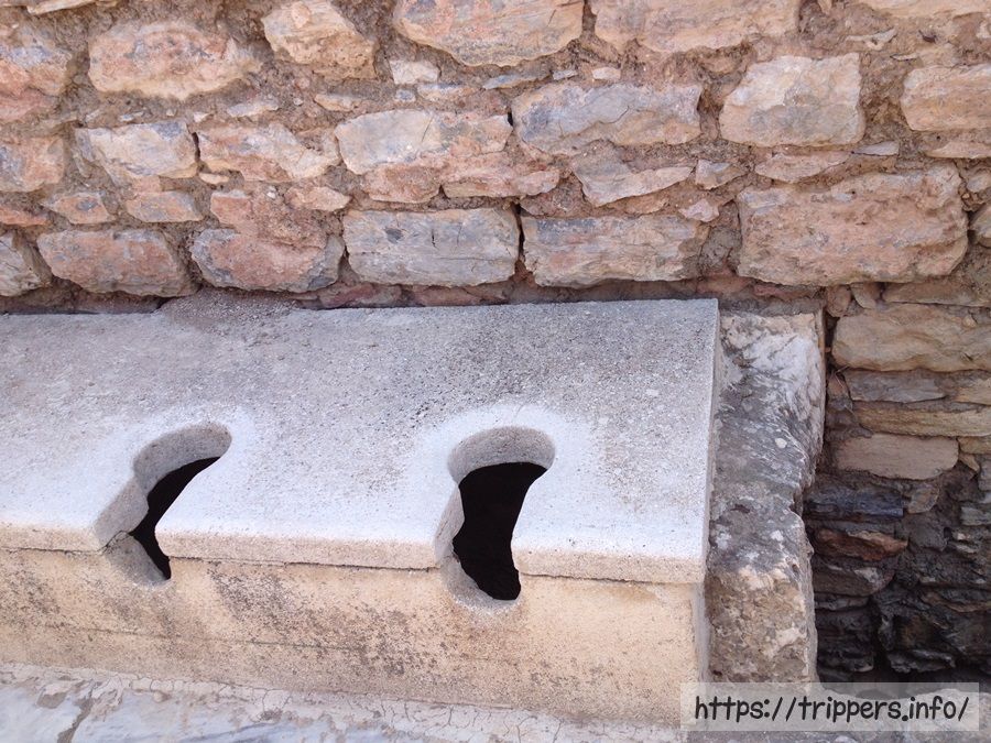 公衆トイレです。大理石の便座に座り、この穴に用を足していたって事ですね。ここに座って写真を撮るのが流行っていました。汲み取り式トイレという日本の文化と異なり下水が流れており高度な水文明です。