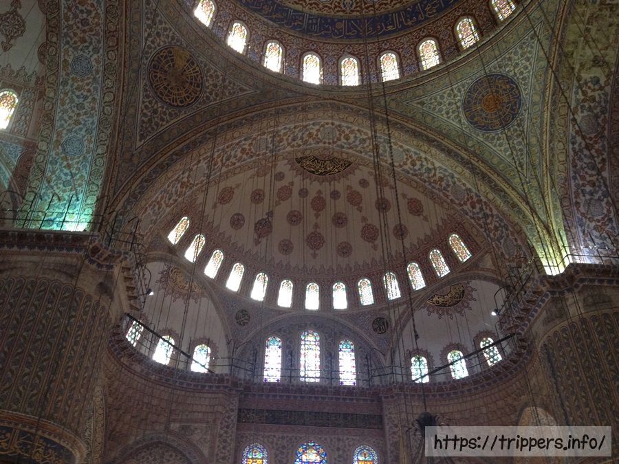 260個の窓があり、どの窓にもステンドグラスの装飾がなされ、2万枚以上の青を主体としたイズニックタイルで覆われています。