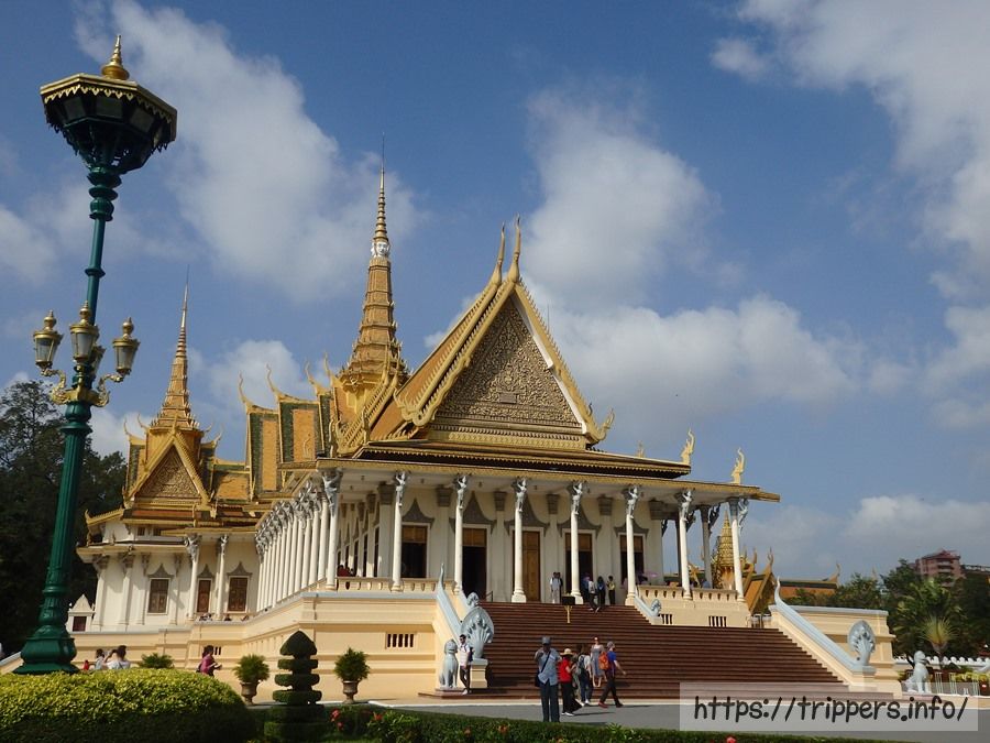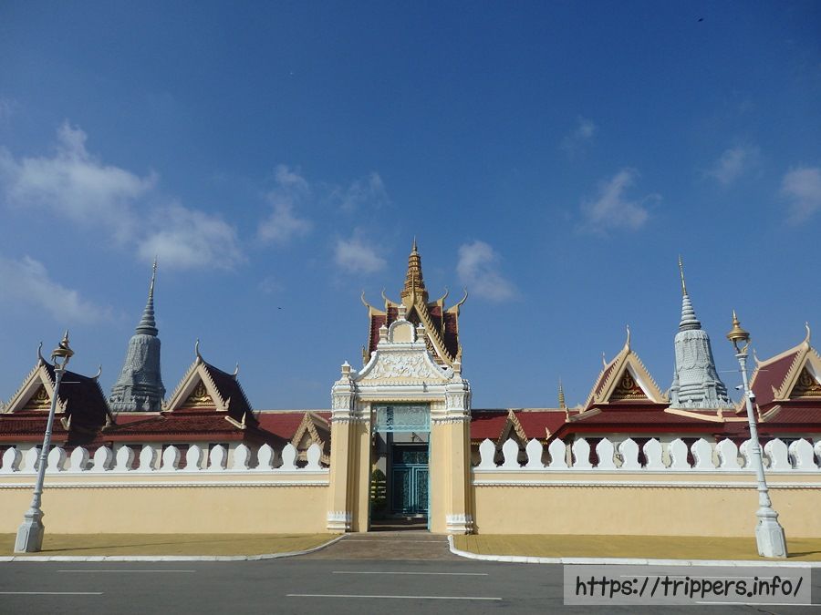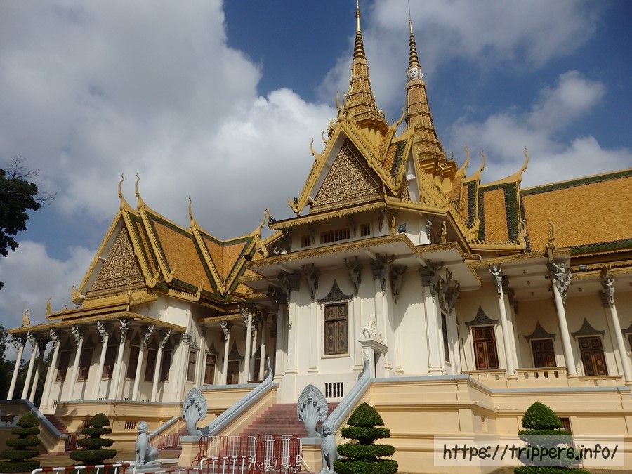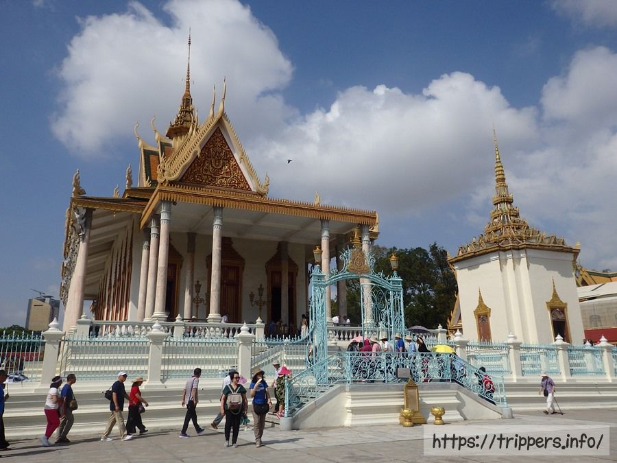 王宮とシルバーパゴダは同じ敷地にあります。まずは王宮です。現ノロドム・シハモニ国王の住居でもあります。目の前に見えるのは即位殿です。