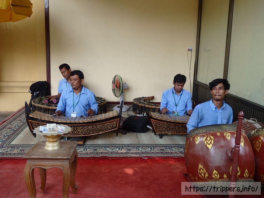 カンボジアの伝統楽器による演奏がありました。真ん中の木琴のようなものがロニアット・アエック、一番奥の環状ゴングはコーン・トムです。
